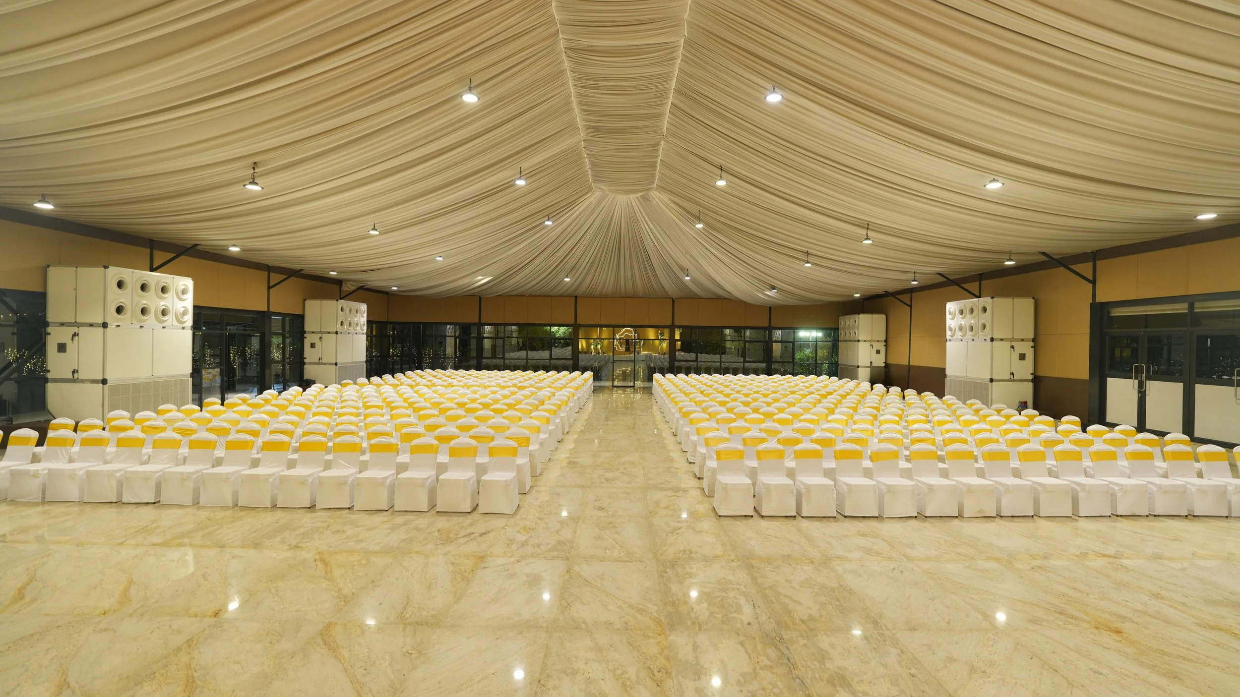 Transform plain ceilings into stunning works of art with drapery. At SPP Gardens' Hanu Reddy Pavilion, the integrated ceiling drapes add a seamless and elegant touch, enhancing the charm of the venue.